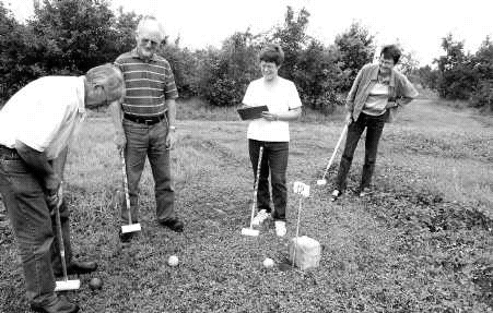 Doris og Laurits Mortensen i lyse trøjer fik sig en dyst med Rigmor og Erling Hansen på den nyanlagte bane. foto: Uffe Bølling Det er Doris og Laurits Mortensen, Lundsmarksvej, der selv har anlagt banen, og her håber parret på, at der fremover hver torsdag aften vil komme mange for at deltage i spillet.Baggrunden for det usædvanlige initiativ er, at Doris og Laurits Mortensen selv de seneste to år har spillet krolf i klubben Fuglsang i Gram, og de er blevet så bidt af spillet, at de nu vil have deres egen bane, hvor alle andre også er velkomne. Rudiengaard roser Annette & Jørgen Krabb overrakte en hilsen fra Fuglsang, og så gik de 30 fremmødte ellers i gang med spillet på de to baner, Doris og Laurits Mortensen har anlagt i forlængelse af hinanden. -------------------------------------------------------------------------------- © JydskeVestkysten og bladets fotografer og journalister har ophavsretten til artikler og fotos. Det er tilladt at tage enkelte kopier på papir til privat brug.